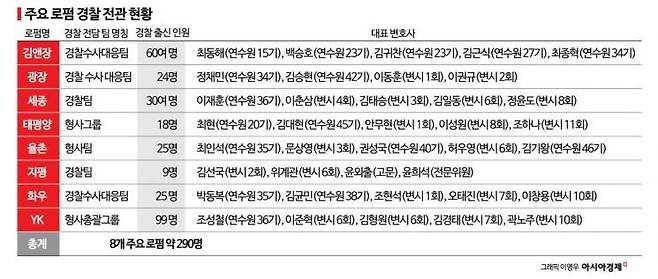 11일 아시아경제 취재 결과 8대 로펌(광장·김앤장·세종·율촌·지평·태평양·화우·YK, 가나다 순)에는 290명 이상의 경찰 출신 전문 인력이 활동 중이다. 이들 로펌은 홈페이지와 홍보 자료를 통해 "불입건 결정 유도", "불송치·각하 결정 도출" 등의 문구를 전면에 내세우며 경찰 전관 영입 성과를 적극적으로 알리고 있다. 형사 사건의 첫 관문인 경찰 수사 단계에서 불송치 결정을 받아야 사건을 깔끔하게 마무리할 수 있다는 인식이 확산하면서 경찰 전관 수요가 빠르게 늘고 있기 때문이다.