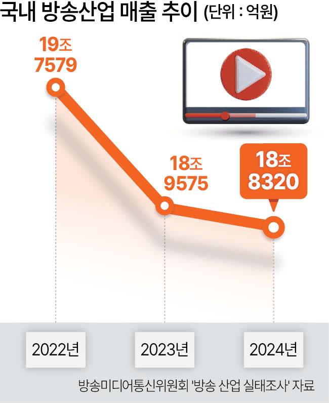 한편, 방송미디어통신위원회에 따르면 국내 방송사업 매출은 2022년 19조7579억원에서 2023년 18조9575억원으로 4.1% 하락했다. 이어 2024년에는 18조8320억원으로 또다시 0.7% 거듭 하락세를 걷고 있다.