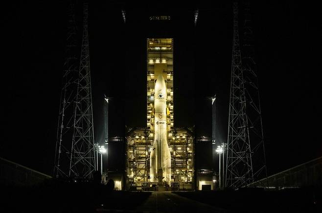[유럽우주기구(ESA)의 위성발사체 아리안 6호 로켓이 지난해 3월 프랑스령 기아나의 우주센터에 서있다. 아마존은 오는 12일(현지시간) 이 로켓을 통해 자사 위성인터넷서비스 '레오'의 저궤도 위성을 발사할 예정이다. (EPA=연합뉴스 자료사진)]