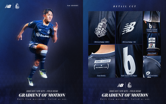 [골닷컴] 배웅기 기자 = 서울 이랜드 FC가 뉴발란스와 함께한 오는 2026시즌 유니폼 'GRADIENT OF MOTION(움직임의 흐름)'을 공개했다.