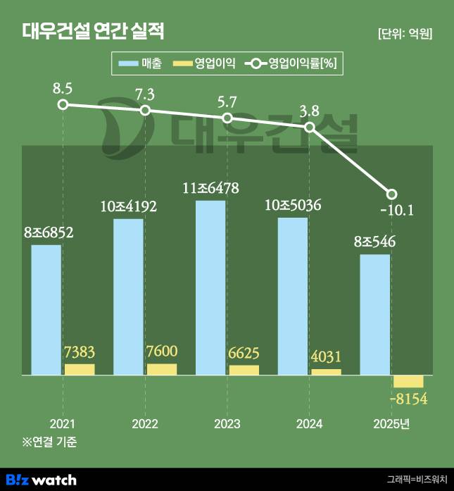 대우건설은 지난해 연결재무제표 기준 잠정 실적을 집계한 결과 매출액 8조546억원, 영업손실 8154억원, 당기순손실 9161억원을 기록했다고 11일 밝혔다. 매출액은 전년 대비 23.3% 감소했으며 영업이익과 당기순이익은 모두 적자 전환했다.