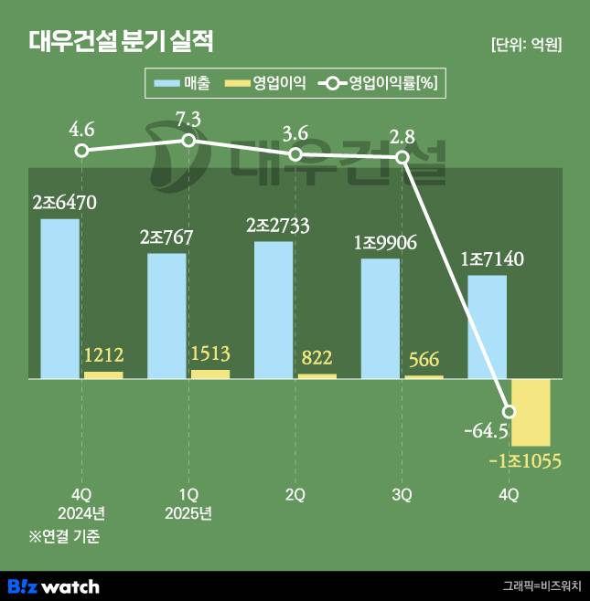 대우건설이 지난해 8154억원에 달하는 영업손실을 냈다. 4분기에만 1조1055억원 손실을 기록하며 적자로 돌아섰다. 지역별 악성 분양 재고와 해외 현장 원가율 상승을 일시에 반영한 영향이라는 설명이다.