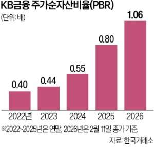 KB금융지주가 주가순자산비율(PBR) 1배를 돌파한 것은 단순한 주가 상승 이상의 의미를 가진다. 국내에서 2001년 금융지주체제가 본격화한 이후 25년 동안 굳어져 온 ‘저평가의 역사’에 변화의 조짐이 나타났다는 점에서다.
