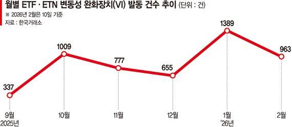 11일 한국거래소에 따르면 이달 들어 지난 10일까지 ETF와 ETN에 VI가 발동된 횟수는 963건에 달했다.