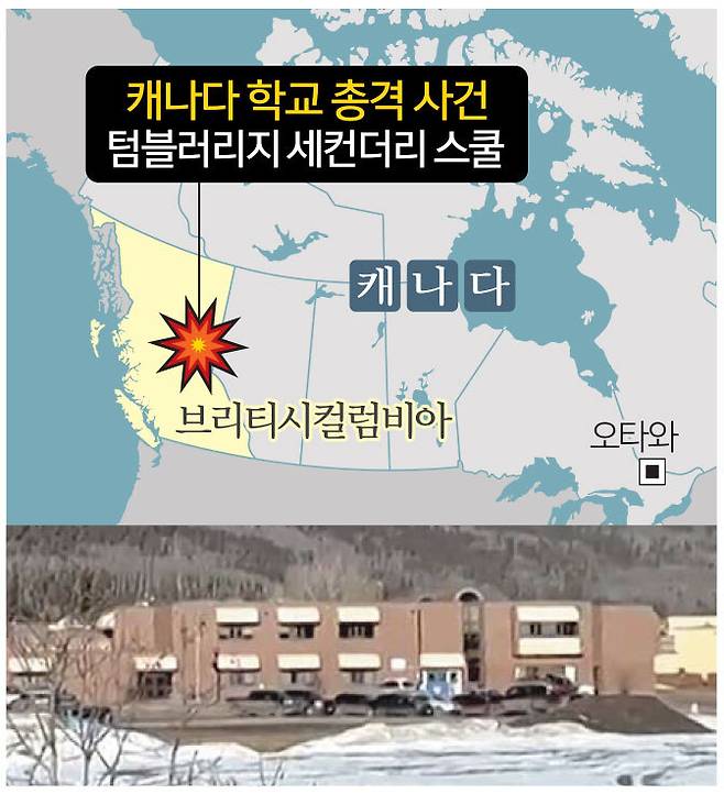 10일(현지시간) AP통신, CNN 등 외신 보도에 따르면 사건은 이날 오후 1시20분 서부 브리티시컬럼비아주 밴쿠버에서 북동쪽으로 1000㎞ 이상 떨어진 소도시 텀블러리지의 텀블러리지 세컨더리 스쿨(중등학교)에서 발생했다.