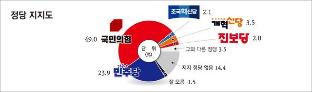 여론조사 결과 국민의힘 지지율은 49.0%로 가장 높았고, 더불어민주당은 23.9%로 뒤를 이었다. '지지 정당 없음'은 14.4%로 나타나 양당 구도 속에서도 의미 있는 규모의 무당층이 존재함을 보여줬다. 그 밖에 개혁신당 3.5%, 조국혁신당 2.1%, 진보당 2.0%, 기타 정당 3.5%였으며 '잘 모름'은 1.5%에 그쳤다.