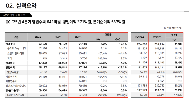 2025년 4분기 실적은 매출 641억원, 영업이익 371억원, 순이익 583억원이다. 매출은 전년 동기 대비 1% 상승했으나, 라이브 서비스 고도화 관련 외주 비용 인식으로 인해 고정비가 증가하며 영업이익이 19.6% 감소했다.