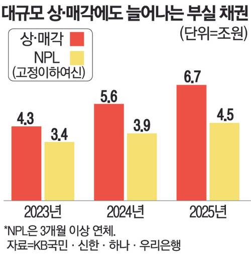 11일 매일경제가 4대 금융그룹의 팩트북을 분석한 결과 작년 한 해 4대 금융그룹 산하 은행들은 총 6조6513억원의 부실 채권을 상·매각했다. 2024년 5조6072억원 대비 18.6%나 늘어난 규모다. 코로나19 때인 2021년 말 상·매각은 2조776억원 정도였는데, 4년 만에 3배 넘게 늘어난 것이다.