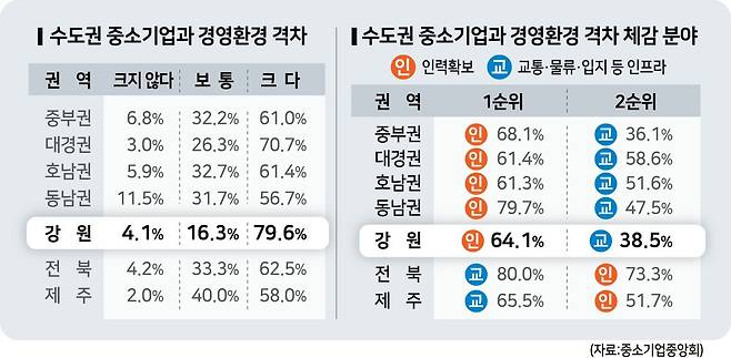 11일 중소기업중앙회가 발표한 '비수도권 중소기업 지원 정책 의견 조사' 결과를 보면 조사에 참여한 강원 중소기업 중 수도권 중소기업과의 경영환경 격차 체감을 묻는 말에 전체의 79.6%가 '크다'고 답했다.