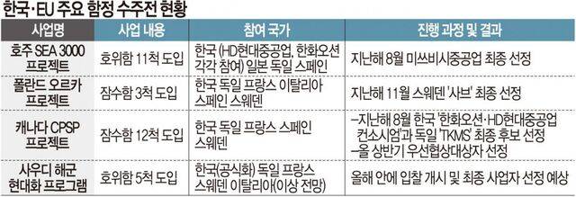 한국은 최근 주요 함정 수주전에서 EU 국가들과 연이어 맞붙고 있다. 2024년 호주의 10조원 규모 호위함 사업에선 HD현대중공업과 한화오션이 개별로 수주에 나섰지만, 일본 독일 스페인 업체와의 경쟁에서 고배를 마셨다. 지난해 8조원 규모 폴란드 잠수함 사업은 한국 기업이 ‘원팀’을 구성해 도전했으나, 유럽 5개 업체와의 경쟁 끝에 사브(스웨덴)에게 밀려났다. EU의 ‘바이 유러피안’ 기조와 북대서양조약기구(NATO) 동맹 등 정치적·지역적 장벽을 넘지 못했다는 분석이 나왔다.