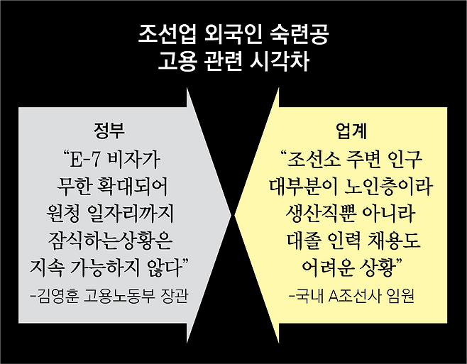 한 업계 임원은 “정부는 내국인을 고용하라 하지만 조선소 인근 지역 고령화가 심각해 생산직은커녕 대졸 인력조차 구하기 어렵다”며 “‘3D 업종’ 기피 문화와 중국 조선사와의 경쟁까지 고려하면 외국인 직고용 축소가 내국인 청년 고용으로 이어지는 선순환은 기대하기 힘들다”고 항변했다.