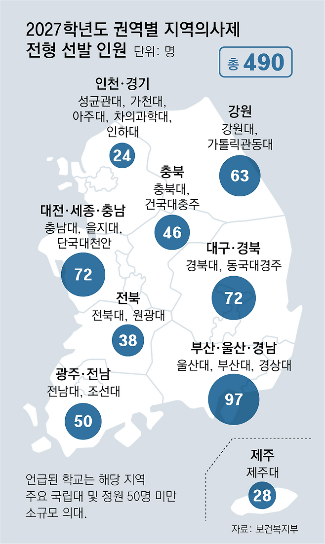 권역별 배정 인원은 대학별 증원 상한선 내에서 교육 여건과 의대 강화 필요성 등을 고려해 다시 대학별로 나눠진다. 정원 50명 미만인 국립대 의대라면 2027학년도에는 기존 입학 정원의 80%까지, 2028학년도부터는 100%까지 증원이 가능하다.