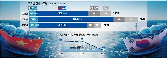 사실상 LNG선은 우리나라가 중국에 우위를 지켜온 거의 유일한 품목이다. 국내 조선 3사(HD현대중공업·삼성중공업·한화오션)는 지난해 세계 LNG선 발주량의 약 80%인 34척을 수주했다.