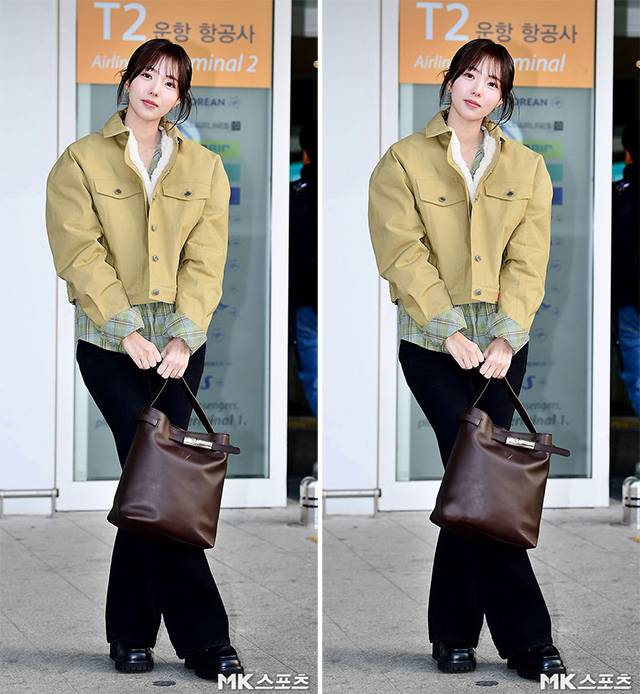 출국장에 모습을 나타낸 채수빈은 옐로우 톤의 크롭 재킷에 체크 패턴 이너 셔츠, 블랙 팬츠를 매치했고, 통굽 슈즈를 더해 캐주얼하면서도 수수한 공항 패션을 완성했습니다.