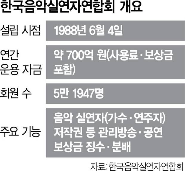 음실련은 지난해 말 기준 5만 1947명의 회원을 두고 있으며 방송·공연 보상금과 저작권 사용료 등 약 700억 원을 매년 징수·분배한다. 1988년 문화공보부 허가를 받아 설립된 후 가수와 연주자 권익 보호 및 수익 배분이라는 공적 책무를 수행하고 있다. 음악 생태계 내 영향력도 작지 않다.