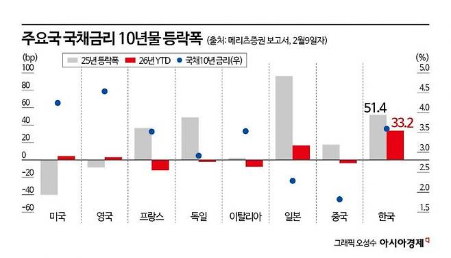 문제는 한국 채권시장이 이미 여러 리스크에 동시에 노출돼 있다는 점이다. 올 들어 국고채 10년물 금리는 40일도 채 되지 않아 30bp(1bp=0.01%포인트) 이상 급등하며 주요국 가운데 가장 가파른 상승세를 보였다. 이는 최근 정책금리를 인상한 일본이나 호주보다도 높은 오름폭이다. 윤여삼 메리츠증권 연구위원은 "현재 한국 시장금리는 1년 뒤 두 차례 금리 인상 기대까지 반영한 수준"이라며 "실제 인상이 없다면 50bp가량 거품이 낀 영역"이라고 진단했다.