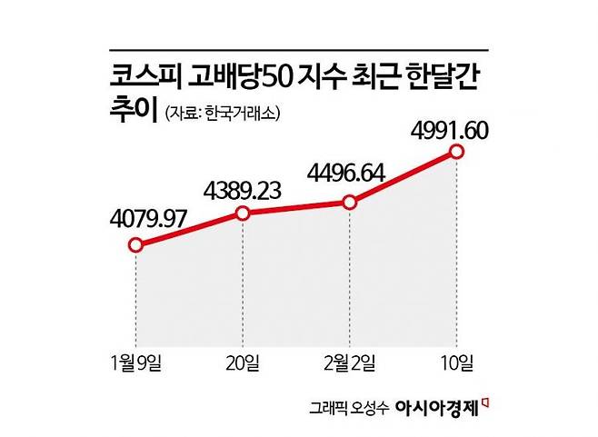 12일 한국거래소에 따르면 10일 기준 코스피 고배당 50지수는 최근 한 달간 23.45% 올랐다. KRX-Akros 고배당주 20지수는 26.0% 상승했다. 같은 기간 코스피는 16.46% 올라 고배당 지수가 코스피를 상회하는 성과를 냈다.