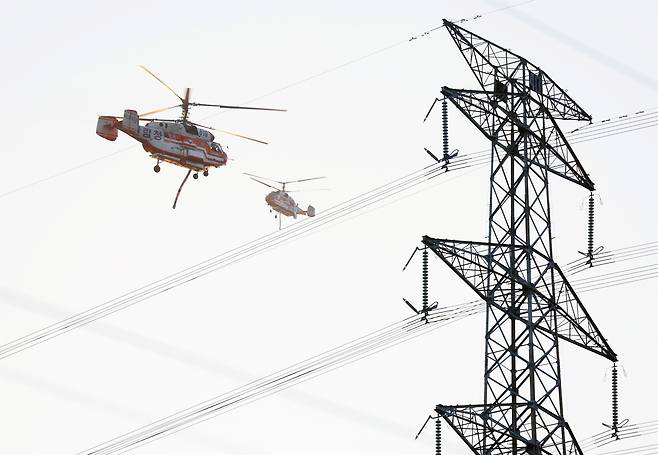 | ▲ 8일 오후 경북 경주시 문무대왕면 일대에서 산불 진화 헬기가 송전탑 사이로 산불 진화작업을 벌이고 있다. |