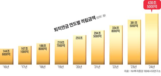 최근 10년간 퇴직연금 적립금은 매년 10%를 훌쩍 넘는 성장 추세를 보이고 있다. 이러한 추세라면 연 15% 성장을 가정했을 때 2025년 말 기준 적립금은 495조원을 넘어서게 되고, 2026년도부터는 500조원 시대를 열어 갈 것으로 기대되고 있다. 이는 전 세계 3위 규모인 국민연금기금 1473조원(25년 12월 잠정치, 국민연금공단)의 3분의 1에 달하는 자산으로 성장한 것이다.
