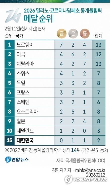 [그래픽] 2026 밀라노·코르티나담페초 동계올림픽 메달 순위(11일)