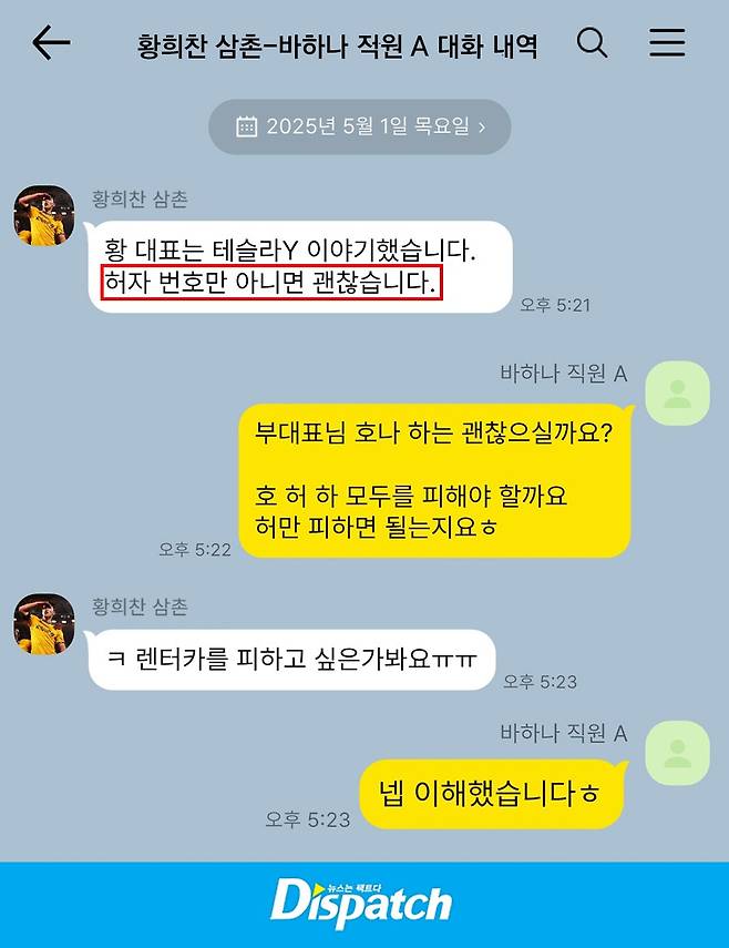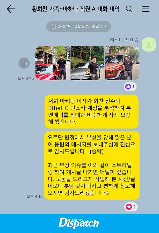 바하나 측은 '디스패치'에 "우리가 법적인 책임을 지더라도 황희찬 선수의 개인 정보가 노출되는 것은 막고 싶었다"며 당시 가해 차량을 바꿔치기한 이유를 설명했다.
