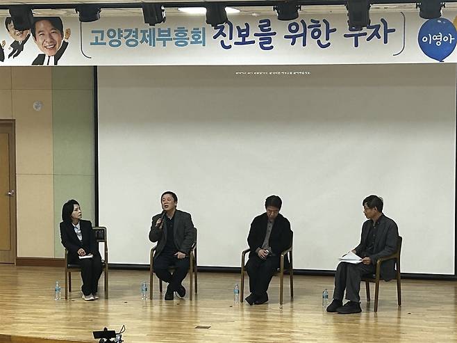 | ▲ 11일 고양시 동부새마을금고 본점 강당에서 열린 '고양경제부흥회' 패널 토론 모습. 왼쪽부터 이영아 민주당 부대변인, 안진걸 소장, 이광수 애널리스트, 오건호 내가만드는복지국가 대표. |