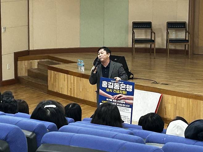 | ▲ 안진걸 민생경제연구소장이 '홍길동은행 상시 긴급지원' 피켓을 들고 서민 금융 지원의 필요성을 역설하고 있다. |
