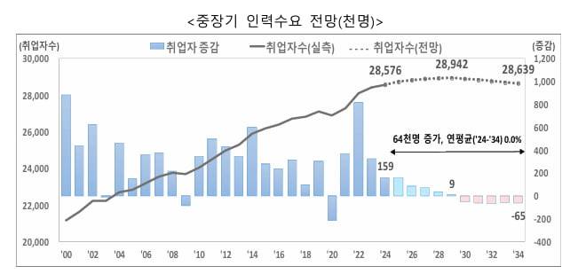 전망 시기를 나눠 보면 취업자수는 2024~2029년에는 36만7000명 증가하지만, 2029~2034년에는 30만3000명 감소한다. 2030년부터 취업자 수가 줄어드는 구조다. 고용률 역시 같은 기간 62.7%에서 61.5%로 1.2%포인트 하락할 것으로 예상됐다.