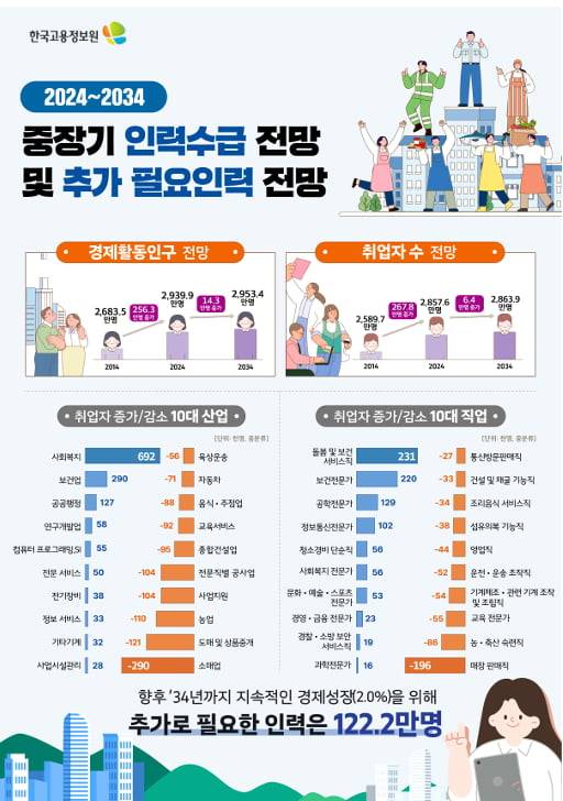 보고서는 노동 공급 제약이 완화되지 않을 경우 우리 경제의 향후 10년 연평균 성장률이 1.6% 수준에 머물 것으로 내다봤다. 지속적인 경제성장 전망 목표치(2.0%)를 달성하기 위해 필요한 인력(노동수요)과 실제 공급되는 인력 사이의 격차인 ‘추가 필요인력’은 2034년까지 총 122만 2000명에 달할 것으로 추산됐다.