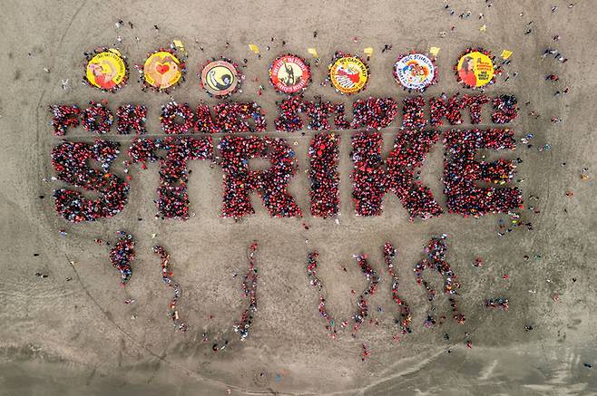 [샌프란시스코=AP/뉴시스] 11일(현지 시간) 미 캘리포니아주 샌프란시스코 오션비치에서 샌프란시스코통합교육구(SFUSD) 교사 파업을 지지하는 사람들이 '학생들을 위한 파업'(FOR OUR STUDENTS STRIKE)이라는 문구의 인간 배너를 만들고 있다. 2026.02.12.