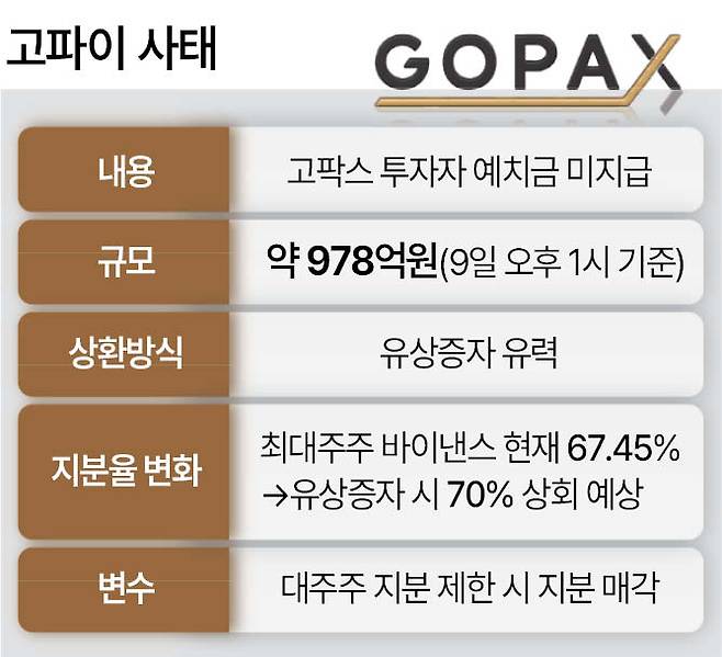 12일 헤럴드경제 취재를 종합하면 바이낸스가 고파이 사태 미지급금(9일 오후 1시 기준 약 978억원)을 해결하기 위한 유력한 방안은 유상증자가 꼽힌다. 디지털자산거래소 고팍스를 운영하는 스트리미가 미지급금 규모에 상응하는 신주를 발행하면, 바이낸스가 이를 사들이고 지분을 늘리면서 스트리미에 자금을 조달하는 방식이다. 이 같은 지분투자 방식은 스트리미의 재무 부담을 덜어주고 법인세 이슈와도 무관한 만큼 시장에서는 현실적인 방안으로 지목한다. 바이낸스는 스트리미 지분 67.45%를 보유한 최대 주주다. 유상증자를 통해 1000억원에 달하는 자금을 조달할 경우 지분은 70%를 넘어설 것으로 보인다.