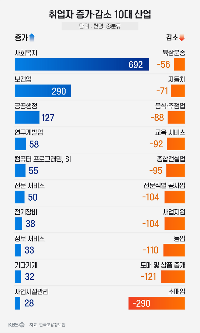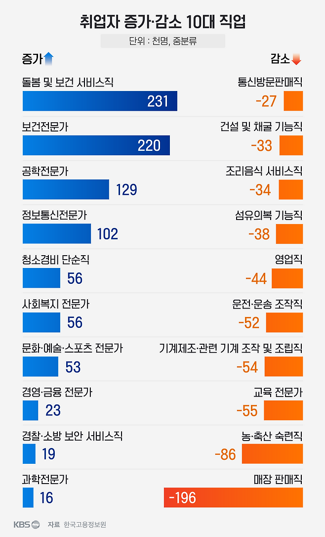 한국고용정보원은 구체적 직업으로는 돌봄·보건 서비스직이 가장 많이 늘고, 매장 판매직이 가장 많이 감소할 것으로 전망했습니다.