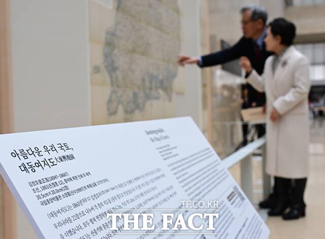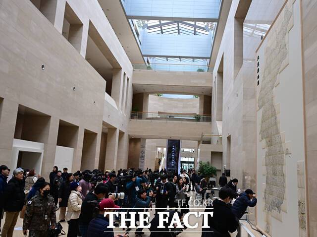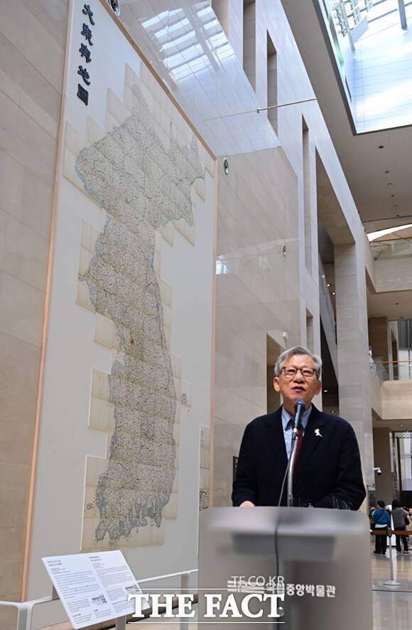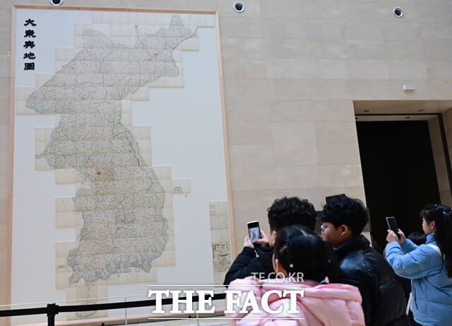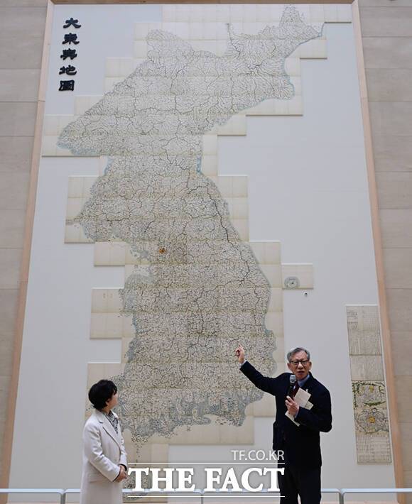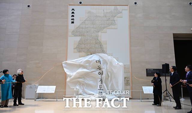 [더팩트ㅣ이새롬 기자] 고산자 김정호(1804~1866)의 ‘대동여지도(大東輿地圖)’ 22첩이 12일 서울 용산구 국립중앙박물관 상설전시실 1층 로비 ‘역사의 길’의 벽면에 전시된 가운데, 유홍준 관장을 비롯한 참석자들이 기념촬영을 하고 있다.