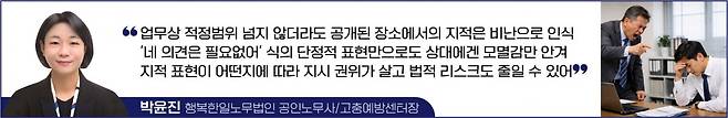 그러나 방법적인 측면에서 보자면 공개적인 방식이 과연 ‘꼭 그렇게 해야만 하는가, 민우씨 입장에서는 어떻게 느껴질까’를 돌아봐야 할 것 같습니다. 업무상 적정범위를 벗어나지 않는다 하더라도 공개적인 지적방식 그 자체는 사람의 감정을 부정적으로 만들 수밖에 없고, 업무적 지시라기보다 비난과 모욕으로 느껴지게 만듭니다. 조사와 판단 과정에서 인격적 비난이나 모욕은 면밀하게 살펴 최종 판단을 하게 되지만, 그보다 먼저 느끼는 민우씨의 ‘피해 감정’이라는 것은 판단 결과보다 먼저 발생해 버린 결과이니까요. 민우씨 입장에서는 어떻게 들릴까를 생각해야 합니다. "네 의견은 필요없어"만 남고 이유나 설명이 사라지면 민우씨에게는 부정적 감정만 남을 수 있습니다. 업무상 잘못을 비판하더라도 그것이 상대의 인격 그 자체를 비하하거나 모멸감을 느끼게 하는 방식으로 이루어지거나 공개적으로 행해지는 모욕적 언사는 업무상 필요성을 넘어서 인격권 침해로 판단될 소지가 있다는 것을 잊어서는 안됩니다.