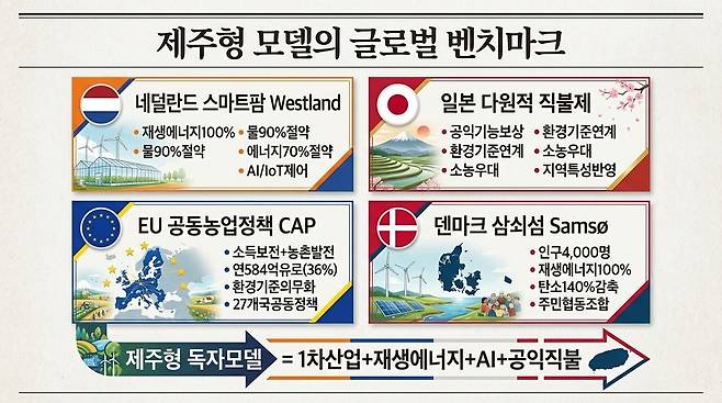 2026년 1월 CES에서 젠슨 황이 보여준 것처럼, 어느 산업이든 기간산업과의 깊은 연계 없이는 혁신도 공허합니다. 제주의 기간산업은 1차산업입니다. 그 위에 재생에너지와 AI를 접목하는 제주형 모델은 네덜란드의 스마트팜, 일본의 공익직불제, EU의 공동농업정책(소득 보전+농촌 발전, CAP), 덴마크 삼쇠섬(Samsø Island, 세계 최초 재생에너지 100% 자립 섬)의 에너지 자립 사례들과 어깨를 나란히 할 수 있는 대한민국의 독자 모델이 될 것입니다.