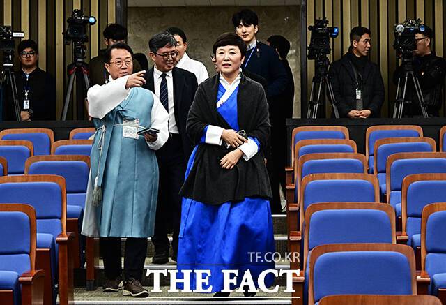 한복을 입은 더불어민주당 의원들이 12일 오후 서울 여의도 국회에서 열린 의원총회에 참석하고 있다.