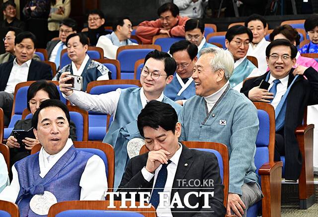 [더팩트ㅣ국회=배정한 기자] 한복을 입은 더불어민주당 의원들이 12일 오후 서울 여의도 국회에서 열린 의원총회에 참석하고 있다.