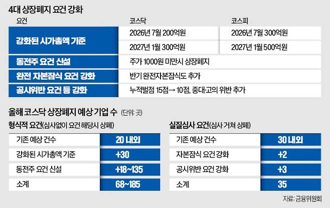 정부가 주가 1000원 미만의 ‘동전주’도 상장폐지 요건에 포함하기로 했다. 시가총액 기준 상장폐지 요건도 적용 시점을 앞당기기로 했다. 부실기업 퇴출을 서둘러 시장 신뢰를 회복하겠다는 취지다. 금융당국은 이번 개편으로 최대 220여곳이 상장폐지 심사 대상에 오를 것으로 보고 있다.