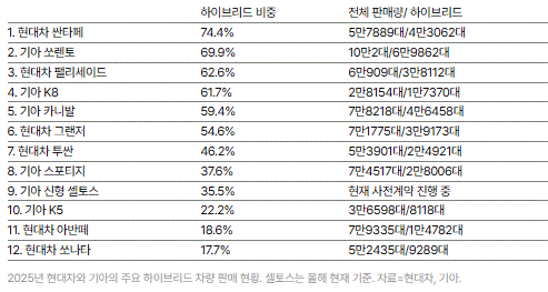 이는 ‘하이브리드가 없어서 못 파는’ 중형급 이상 시장과는 딴판이다. 실제 현대자동차와 기아 중 중형급 이상인 싼타페(74.4%), 쏘렌토(69.9%), 팰리세이드(62.6%), K8(61.7%) 등은 지난해 하이브리드 선택 비중이 압도적이다. 반대로 체급이 낮아질수록 하이브리드 인기는 급감했다. 준중형급인 투싼(46.2%), 스포티지(37.6%), 아반떼(18.6%) 등은 절반을 넘지 못했다.