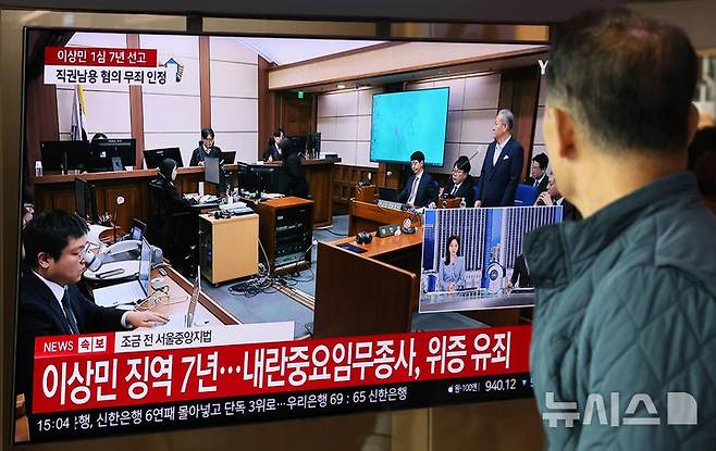 [서울=뉴시스] 배훈식 기자 = 12일 서울 용산구 KTX서울역 대합실에서 시민들이 이상민 전 행정안전부 장관의 내란중요임무 종사 등의 1심 선고 재판을 지켜보고 있다.
