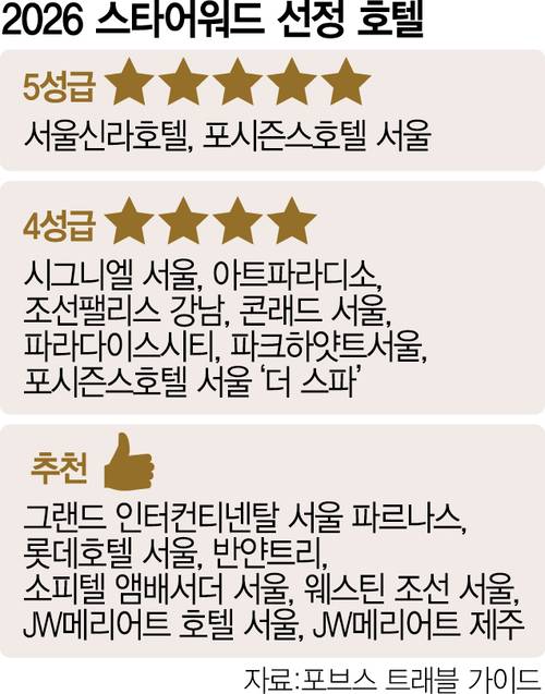 11일(현지 시간) 미국의 럭셔리 여행 평가 전문지 ‘포브스 트래블 가이드’가 발표한 2026년 스타어워드 선정 결과, 국내 16개 호텔이 명단에 올랐다. 포브스 트래블 가이드의 스타어워드는 전 세계 95개국의 호텔과 리조트, 크루즈 등을 대상으로 매년 실시하는 글로벌 평가다. 신분을 숨긴 평가단이 매년 전 세계 호텔을 방문해 900개에 달하는 엄격한 기준에 따라 시설 및 서비스를 평가하고 5성∙4성∙추천 호텔로 등급을 나눠 발표한다.
