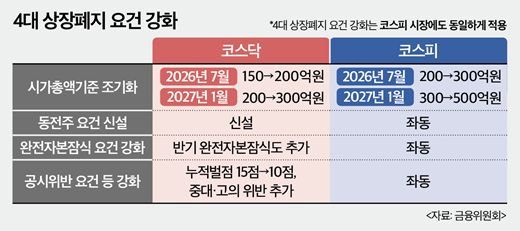 [뉴스토마토 김주하 기자] 금융당국이 코스닥 부실기업을 신속히 정리하기 위해 상장폐지 요건을 전면 강화합니다. 시가총액 기준을 앞당겨 상향하고 주가 1000원 미만 '동전주'를 퇴출 대상에 포함해 시장의 퇴출 기능을 대폭 끌어올립니다. 거래소 시뮬레이션 기준 올해 상장폐지 대상은 약 150개사, 많게는 220개사에 이를 전망입니다.