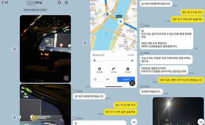 차량 경고등 원인에 대해 김 대표는 “기름이 없었다. 푸로산게는 12기통이라 기름 한 칸 남을 때까지 두면 안되는 것 같습니다. 저도 이번에 배웠네요.” 라고 설명하였음.