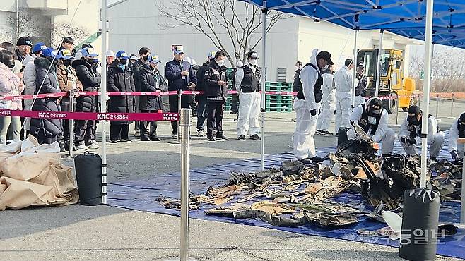 이날 국립과학수사대 등은 오전 조사 과정에서 유류품 19점이 확인했으며 기체 잔해를 외장재·내장재·전자·전장품 등으로 분류해 컨테이너 4동으로 전부 옮길 때까지 매주 재조사를 진행할 예정이다. 부피가 큰 기체 꼬리날개는 별도 가건물을 설치해 보관할 계획이다.