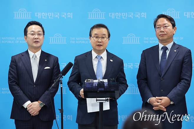 | ▲ '이재명 대통령 사건 공소취소와 국정조사 추진을 위한 의원모임(가칭)' 출범 더불어민주당 이건태, 박성준 의원을 비롯한 의원들이 12일 국회 소통관에서 '이재명 대통령 사건 공소취소와 국정조사 추진을 위한 의원모임(가칭)' 출범 기자회견을 하고 있다. |