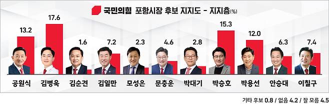 김일만 포항시의회 의장(6.4%)의 지지세도 꾸준함이 확인됐다. ‘자족도시 건설’을 기치로 내건 그는 영일만항 물동량 확대와 호미곶 국가 거점 육성 등 구체적인 공약으로 바닥 민심을 훑고 있다.