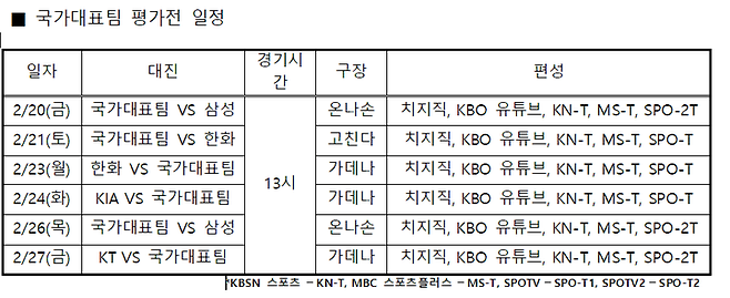 대표팀은 오는 20일 삼성과의 경기를 시작으로 21일과 23일은 한화, 24일 KIA, 26일 삼성, 27일 KT까지 총 4개 구단을 상대로 6차례 평가전을 치른다.
