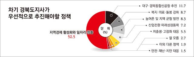 대구일보가 실시한 여론조사에서 차기 경북도지사가 우선 추진해야 할 과제로 '지역 경제 활성화와 일자리 창출'이 가장 높은 응답을 기록했다.