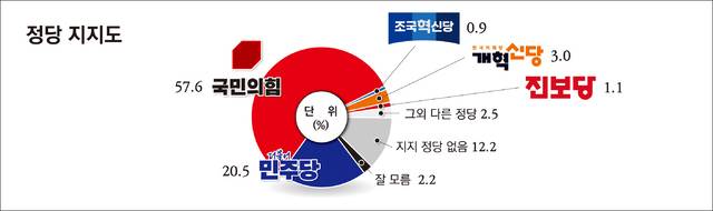 여론조사 결과 국민의힘 지지율은 57.6%로 가장 높았고, 더불어민주당은 20.5%로 뒤를 이었다. '지지 정당 없음'은 12.2%로 나타났으며, 개혁신당 3.0%, 진보당 1.1%, 조국혁신당 0.9%, 기타 정당 2.5% 순이었다. '잘 모름'은 2.2%로 집계됐다. 전반적으로 국민의힘 초강세 지지 기반이 유지됐지만, 무당층이 두 자릿수를 기록한 점도 주목된다.
