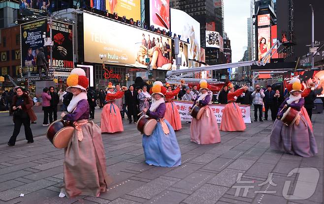 (서울=뉴스1) = 11일 오후(현지시간) 미국 뉴욕 타임스퀘어 광장에서 ‘코리아 온 스테이지 인 뉴욕’의 사전 공연인 소고춤과 진도북춤 공연이 펼쳐지고 있다.